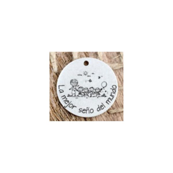 Colgante grabado en láser La mejor Seño del mundo 35mm de Zamak bañado en plata.