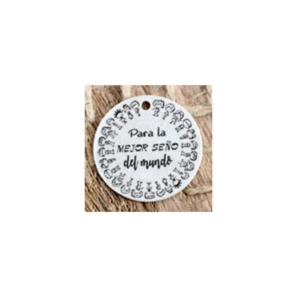 Colgante grabado en láser La mejor Seño del mundo 35mm de Zamak bañado en plata.