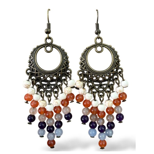 Pendientes estilo Boho con base labrada y abalorios de ágata teñida y howlita, de 7,5cm de largo.